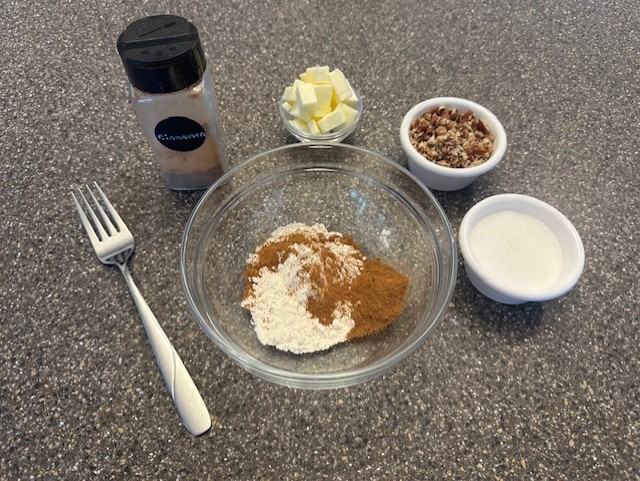 - Prepare the streusel topping by blending together the butter, sugar, flour, cinnamon and nuts. The mixture will have a texture similar to wet sand.