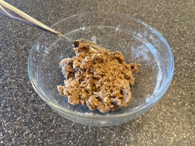 Step 5: Prepare the streusel topping by blending together the butter, sugar, flour, cinnamon and nuts. The mixture will have a texture similar to wet sand.