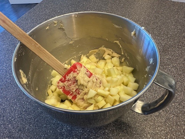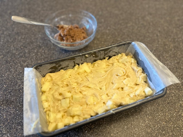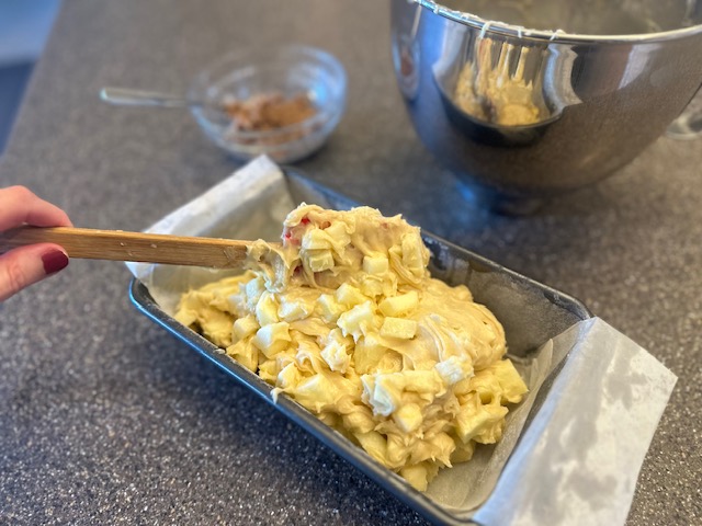 Step 7: Using a rubber spatula, fold the diced apples into the batter. Pour the batter into the prepared loaf pan.