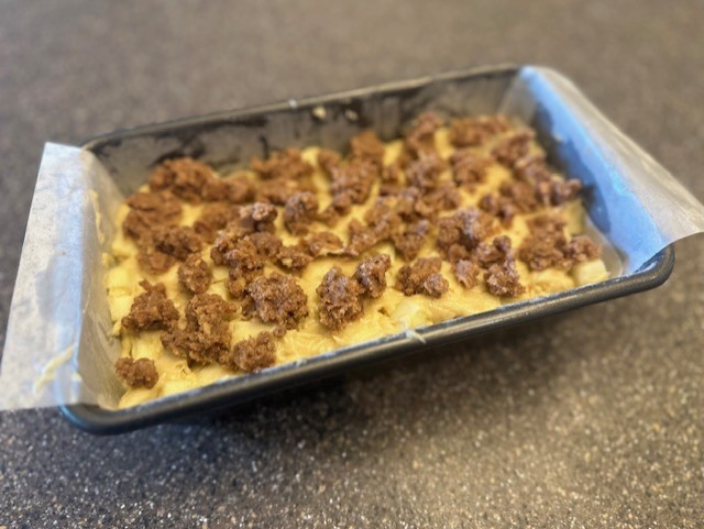 Step 8: Crumble the topping evenly over the surface of the batter and bake in the preheated oven for about 1 hour, but up to about 70 minutes. A toothpick inserted into the center of the bread should come out clean. If using a thermometer, the internal temperature should be between 190-200℉.