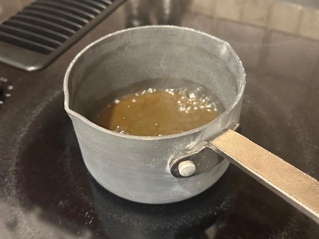 - While the bread is cooling, preparing the glaze. Reduce the apple cider in a small pan over medium-high heat by half, about 7-8 minutes. This helps to concentrate the apple flavor.