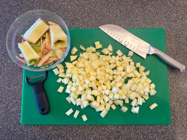 Step 6: Peel and quarter the apples, cutting out the core, and then dice into small pieces. Toss lightly with a sprinkle of lemon juice, if needed, to prevent the apples from oxidizing (browning).