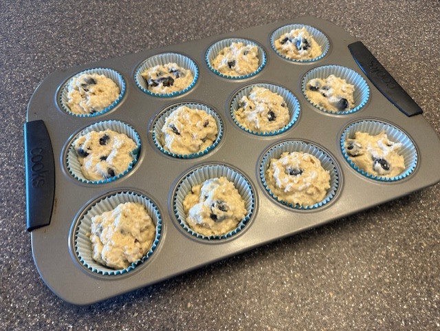 - Use a rubber spatula to gently begin folding all of the ingredients together. You don't want to press the blueberries, nor over work the batter. Once you have a cohesive batter with no streaks of flour, you're ready to spoon the mixture into the muffin tins, filling the paper liners ¾ of the way full.Note: Overfilling the muffin cups will likely lend to muffins that bake with a flat top or spill over the top and stick to the pan, making them difficult to remove.