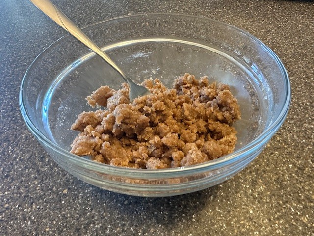 - Prepare the streusel topping. In a small bowl, add the flour, brown sugar, granulated sugar and cinnamon. Stir together with the melted butter until crumbly.