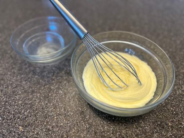 Step 3: In a small bowl, whisk the egg. In a separate bowl, weigh the sugar, then mix both until pale yellow in color. Add in the vanilla extract, and slowly incorporate the melted butter, a little at a time. The mixture will be very thick.