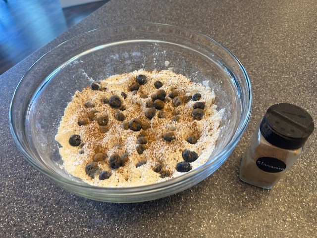 Step 5: Into the bowl of dry ingredients, add the cinnamon and the blueberries, tossing the berries by hand to make sure they are well coated in the flour mixture.