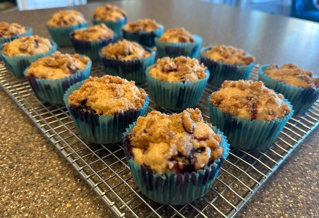 Step 8: Sprinkle the crumbled topping over the muffin batter. Bake 20-25 minutes, or until the tops are lightly golden and a toothpick inserted into the center comes out clean. Allow muffins to cool a few minutes while still in the pan, then remove and place on a cooling rack.