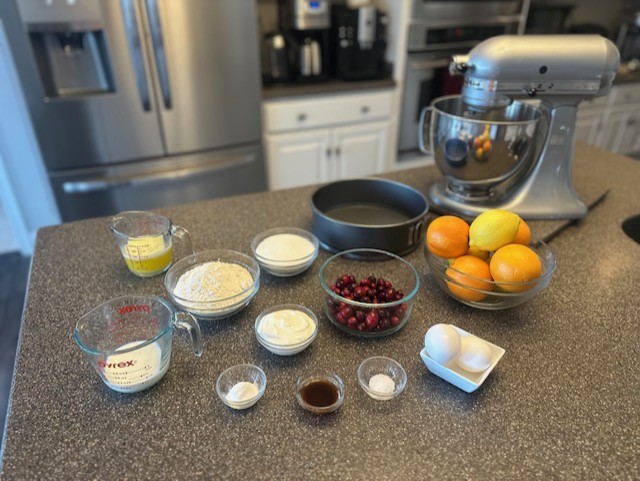 Step 1: Gather all of your cake ingredients. Preheat the oven to 350℉ and prepare your springform pan by spraying the bottom and sides lightly with cooking spray, lining with a 9" silicone baking sheet, or parchment with a light dusting of flour. Set aside.