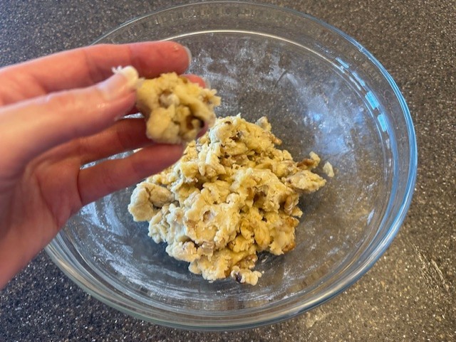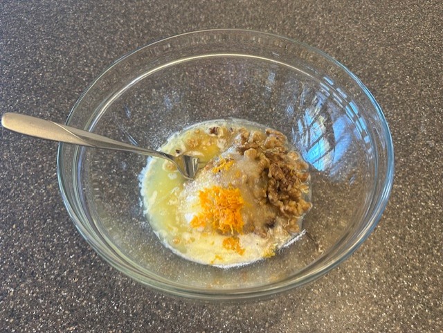Step 5: In a clean mixing bowl, prepare the streusel topping by stirring together the flour, walnuts, sugar, citrus zest, juice and salt. Stir in the melted butter until crumbly. The mixture should easily hold its shape.
