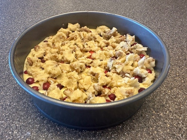 Step 4: Pour the mixture into the prepared pan, smoothing out the surface with an offset spatula or a rubber spatula. Sprinkle the surface evenly with the cranberries and set aside.