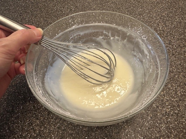 Step 7: In the meantime, while the cake is baking, prepare the glaze: In a small bowl, whisk together the sifted powdered sugar, sour cream, milk and juice from half an orange.