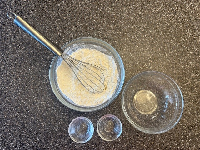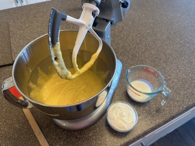 Step 3: In separate mixing bowl, whisk together the dry ingredients (flour, baking powder and kosher salt). Combine the wet and dry ingredients together, then mix in the sour cream and milk.