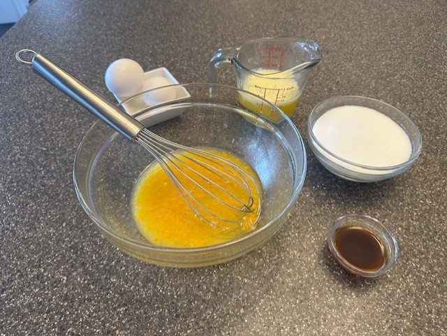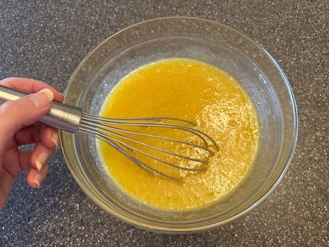Step 2: In a mixing bowl, zest your orange and lemon. Slice your fruit and squeeze, measuring out the juice until you have about 1 Tablespoon of each. Mix in the sugar, melted butter, eggs and vanilla extract, and whisk everything together.