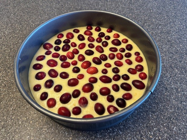 - Pour the mixture into the prepared pan, smoothing out the surface with an offset spatula or a rubber spatula. Sprinkle the surface evenly with the cranberries and set aside.
