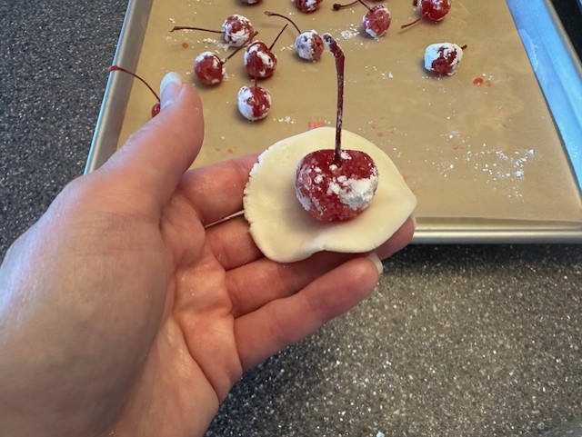 - After an hour, remove the sugar paste dough from the refrigerator and begin portioning small rounds using a teaspoon. With clean hands, gently knead and press to flatten using your thumb. You want the layer to be as thin as possible. Wrap the dough around each cherry, up to the stem, covering it completely.