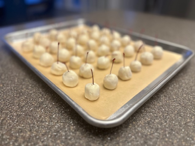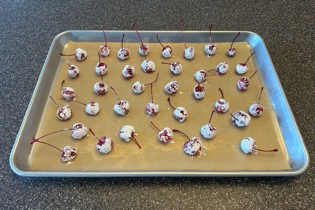 - Dip each cherry into the reserved tablespoon of powdered sugar and place onto a parchment lined sheet pan. Freeze the cherries for one hour. This step will make the following steps much easier.