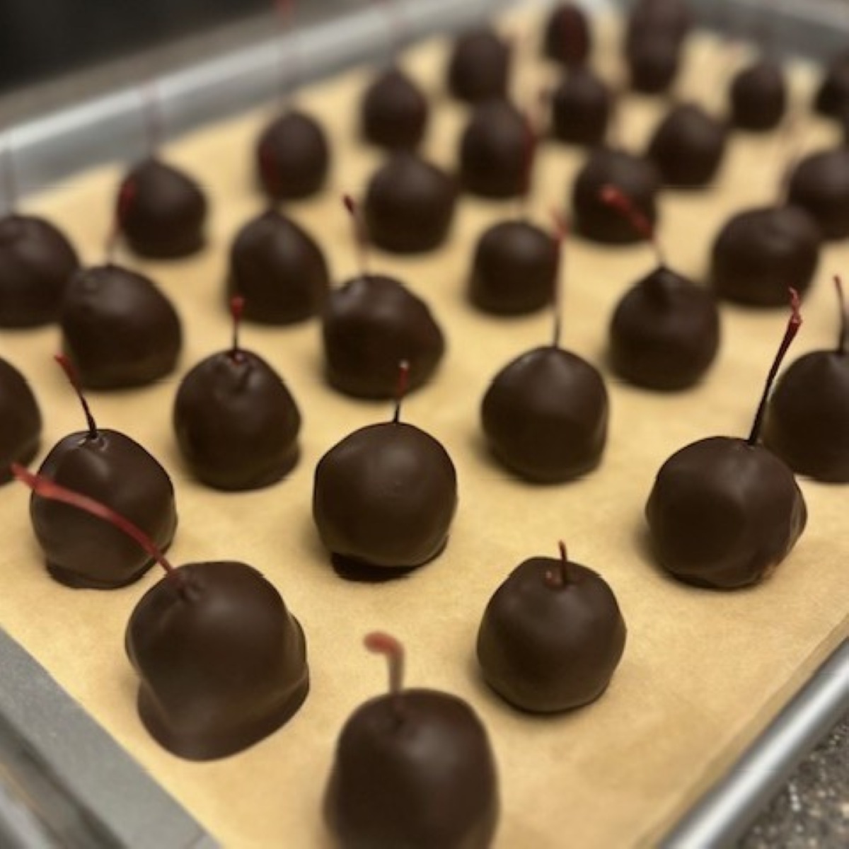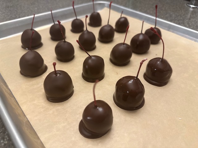 Note: An excess of chocolate will create a base beneath the cherry, which is perfectly fine. If you prefer a cleaner, more 'professional' look, simply use the extra pan with a fresh sheet of parchment and as cherries begin to set but are not yet firm, move them from one pan to the other.