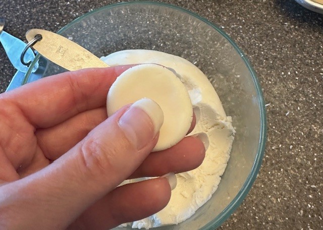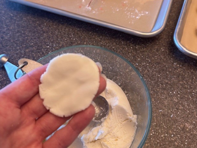 Step 4) After an hour, remove the sugar paste dough from the refrigerator and begin portioning small rounds using a teaspoon. With clean hands, gently knead and press to flatten using your thumb. You want the layer to be as thin as possible. Wrap the dough around each cherry, up to the stem, covering it completely.