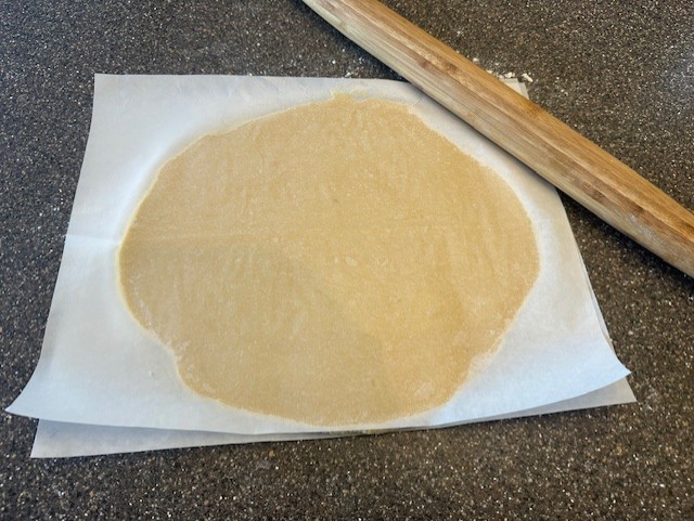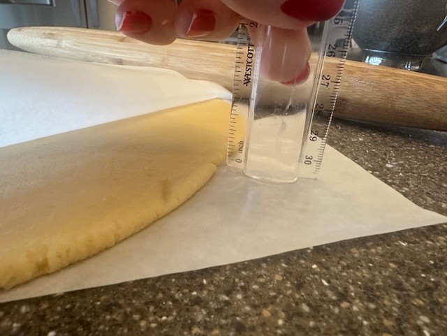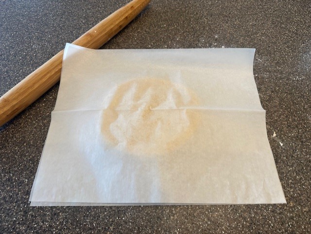 - Prepare your worksurface for easier rolling by placing a damp paper towel down, then laying a piece of parchment paper on top. Using the rolling pin, gently tap the dough to flatten slightly, lay an additional piece of parchment to the top, then roll out the dough to about an ¼" thickness. Repeat with the second ball of dough. Layer each disk of dough, still in its parchment "blanket" on a sheet pan and pop into the refrigerator for at least thirty minutes, or up to one hour, to chill.