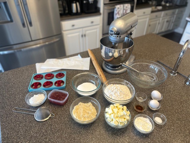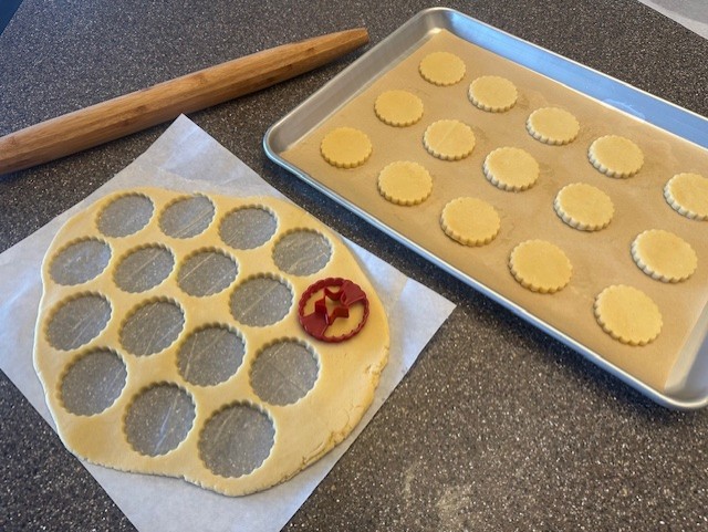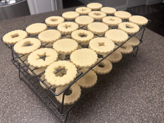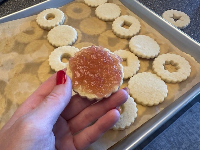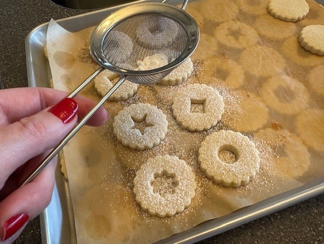 - Once the cookies have completely cooled, move the cookies back to the baking sheets. Using a small fine mesh strainer or a powdered sugar sifter, dust the tops of the cookies with the small cutout. Spread about a teaspoon of jam onto the 'base' cookies and sandwich the two together.