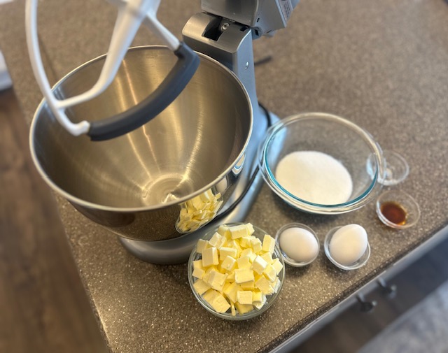 Step 3) In the bowl of stand mixer, cream together the butter and the sugar until light in color, about 2 minutes. After scraping down the sides of the bowl, add in the eggs, one at time, and mix at a low speed until the mixture is no longer glossy. Add both extracts.