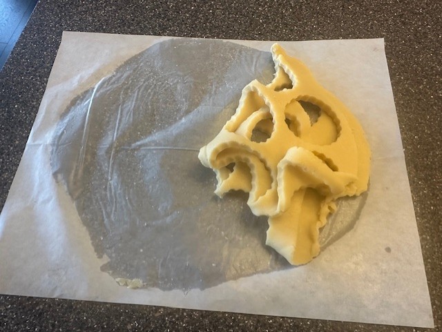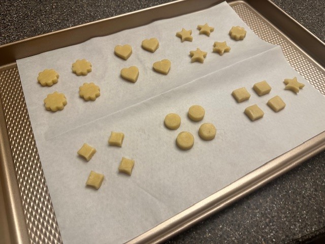 - Working with one disk of dough at a time, and using the larger, base-end of the cookie cutter, stamp out 48 cookies. Place them immediately onto a parchment lined sheet pan, spaced evenly apart, while the dough is still cold. There will be minimal 'spreading' but the cookies will puff slightly while baking. You'll re-roll scraps and continue the same steps until you have enough.
