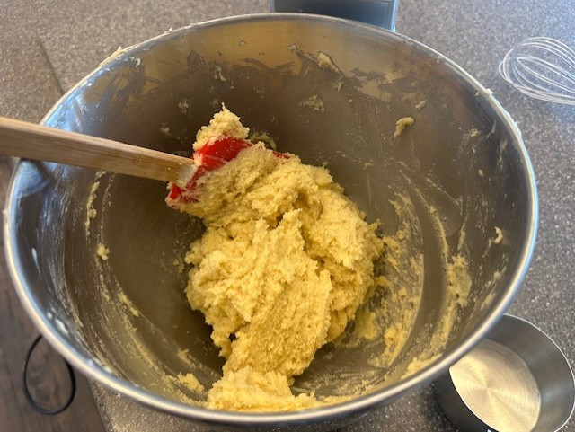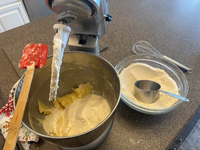 - In the bowl of stand mixer, cream together the butter and the sugar until light in color, about 2 minutes. After scraping down the sides of the bowl, add in the in eggs, one at time, and mix on low speed until the mixture is no longer glossy. Add in both extracts.Slowly begin to incorporate the flour mixture, a little at a time, and mix until a soft dough forms.