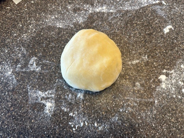 Step 4) Move the dough to a clean worksurface dusted lightly with flour and divide it into two equal portions. Knead each ball of dough into a smooth ball.