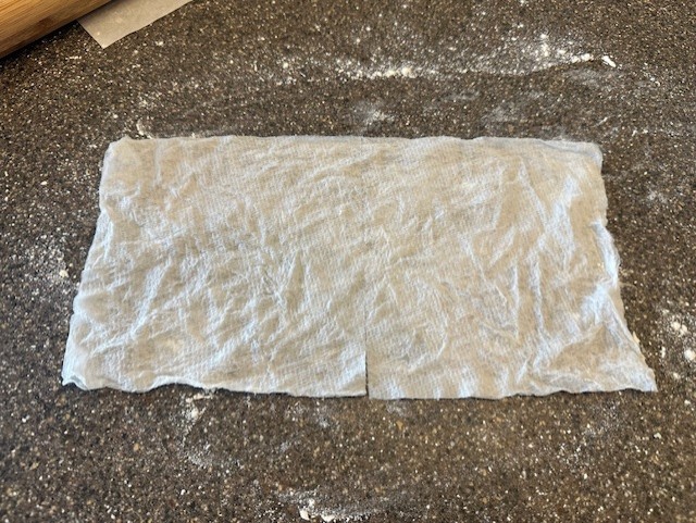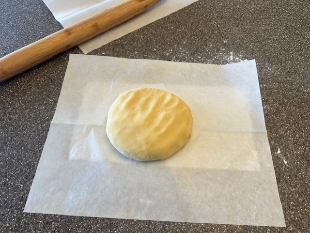 Step 5) Prepare your worksurface for easier rolling by placing a damp paper towel down, then laying a piece of parchment paper on top. Using the rolling pin, gently tap the dough to flatten slightly, lay an additional piece of parchment to the top, then roll out the dough to about an ¼" thickness. Repeat with the second ball of dough.