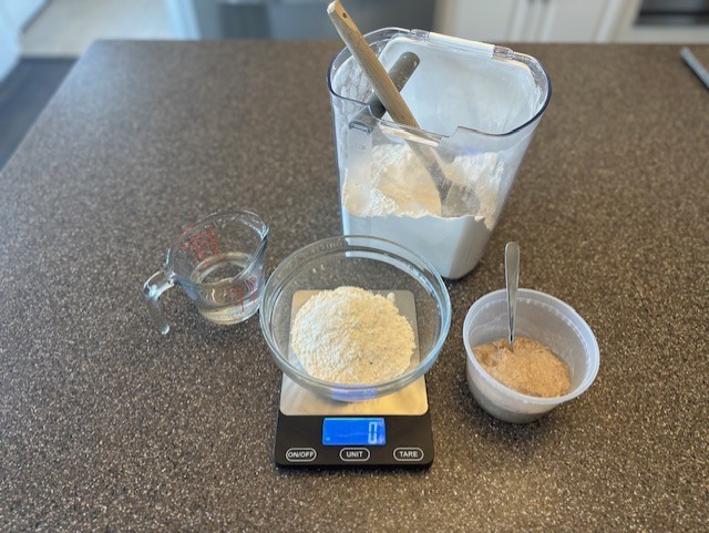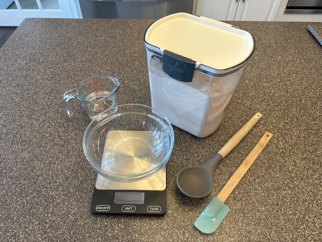 • To begin, gather your whole wheat flour and water, along with a digital kitchen scale, a medium-sized mixing bowl and a small rubber spatula. Note: You will not need any all-purpose flour at this point.