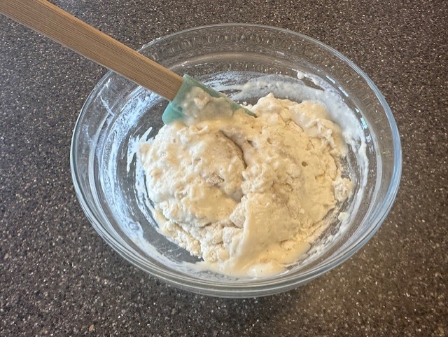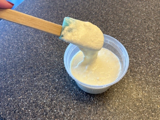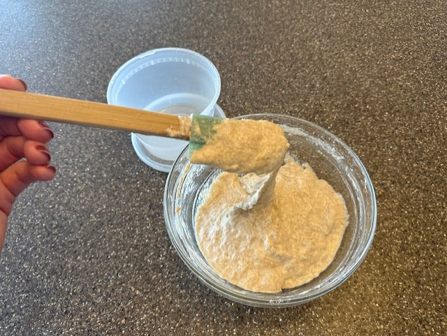 • Using the spatula, fold together the flour and water until the mixture comes together to form a thick paste. Be sure not to leave any loose traces of unmixed flour. Move the mixture into a clean container and cover, allowing it to rest at room temperature for approximately 12 hours.