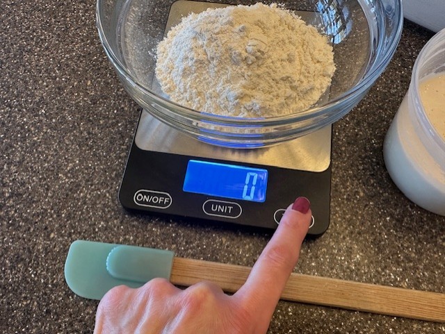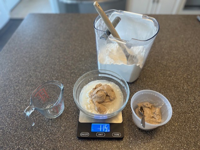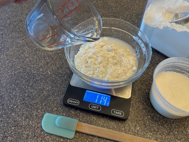 • Press the tare button again, removing the weight of both the bowl and the flour, and pour in the water, about a ½ cup, adding in an equal amount, in grams, to match the weight of the flour. If you weighed 112 grams of flour, you should add in 112 grams of water.