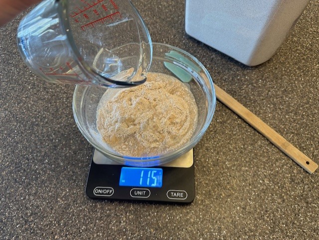 • Place the mixing bowl onto the digital scale and be sure to press the tare button to remove the weight of the bowl itself, leaving you with a 0-starting weight in grams. Weigh out the whole wheat flour to anywhere between 110-115 grams.